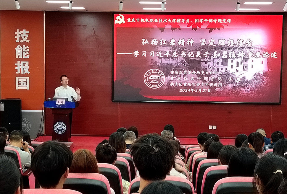 5月21日下午,党委学工部邀请重庆红岩干部学院王超副教授做客“鼎兴”讲坛,在F219学术报告厅作了《弘扬红岩精神 坚定理想信念》主题讲座。党委学工部部长李云杨、校团委书记唐显峰、各学院总支书记、全体辅导员及学生干部代表200余人聆听讲座。